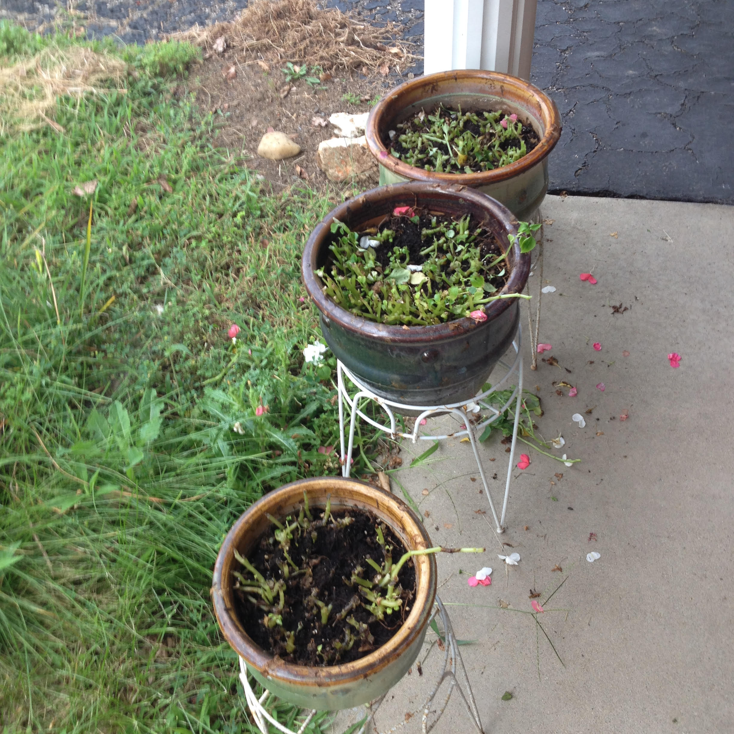 Several days ago, a bunny rabbit happened along during the night and made good progress with devouring one of the pots of impatiens that was lower to the ground. Then, this past Wednesday morning, I awoke to discover that the deer had returned! WOW, did they do a good job of getting rid of my pesky impatiens!! (Click below to get a close-up view of some of the carnage!)