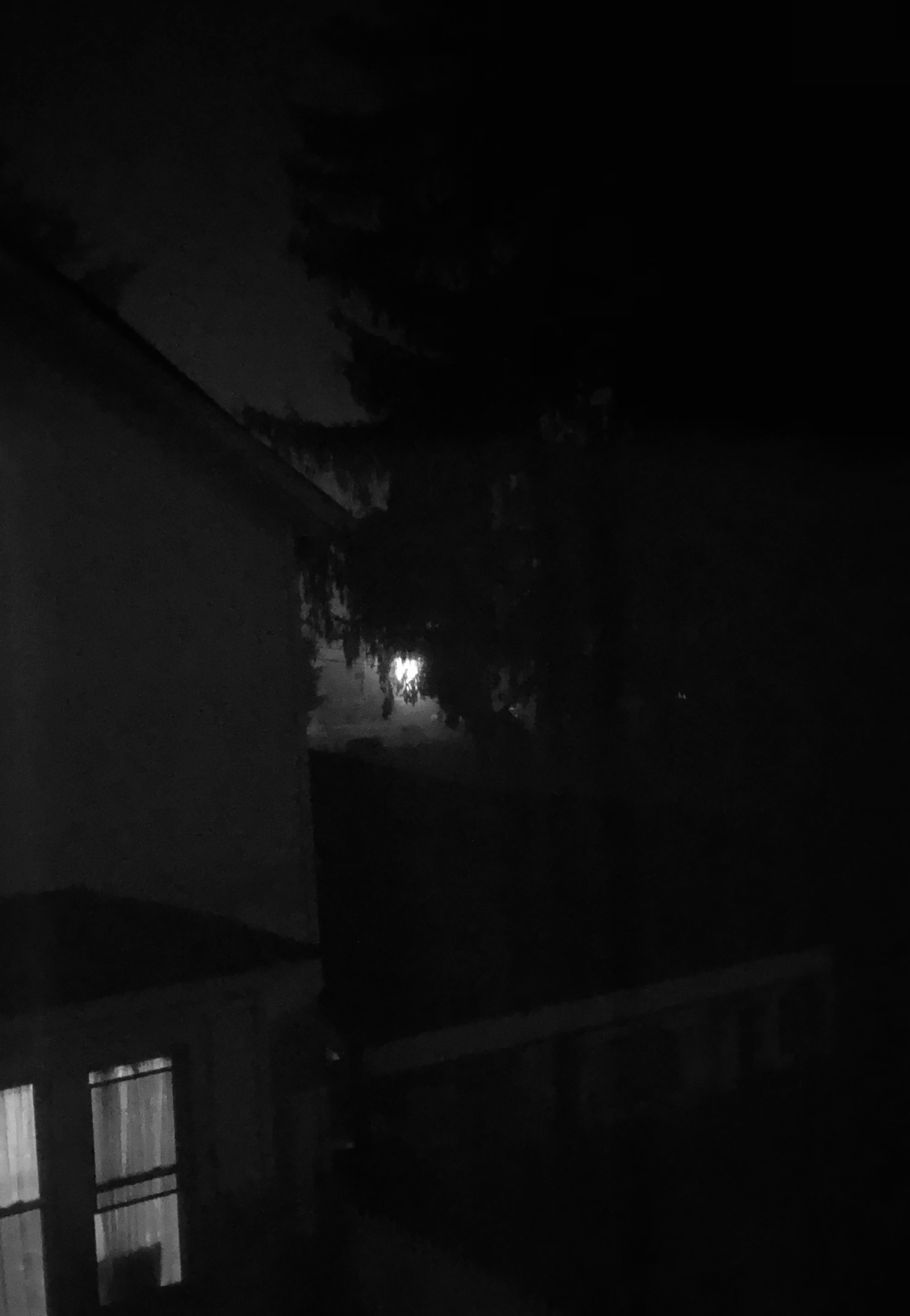 I made them black & white. I don’t know if you can really see just how dense the fog is. But here’s a view from the window at the top of the stairs, and one of my neighbor’s yard, taken from one of the windows in the upstairs bathroom.
