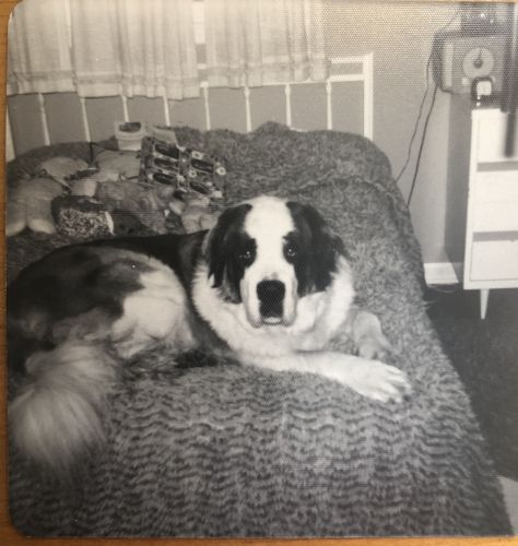 I was actually taking a picture of my dog, Brindle. However, you can sort of see my room. You can see that great old Zenith radio!! That was the actual radio I listened to, even though it was probably 20 years old by then — a castoff from my parents. (I never had any sort of state-of-the-art hi-fi equipment, ever. Even my record player was a portable, battery-operated thing.)