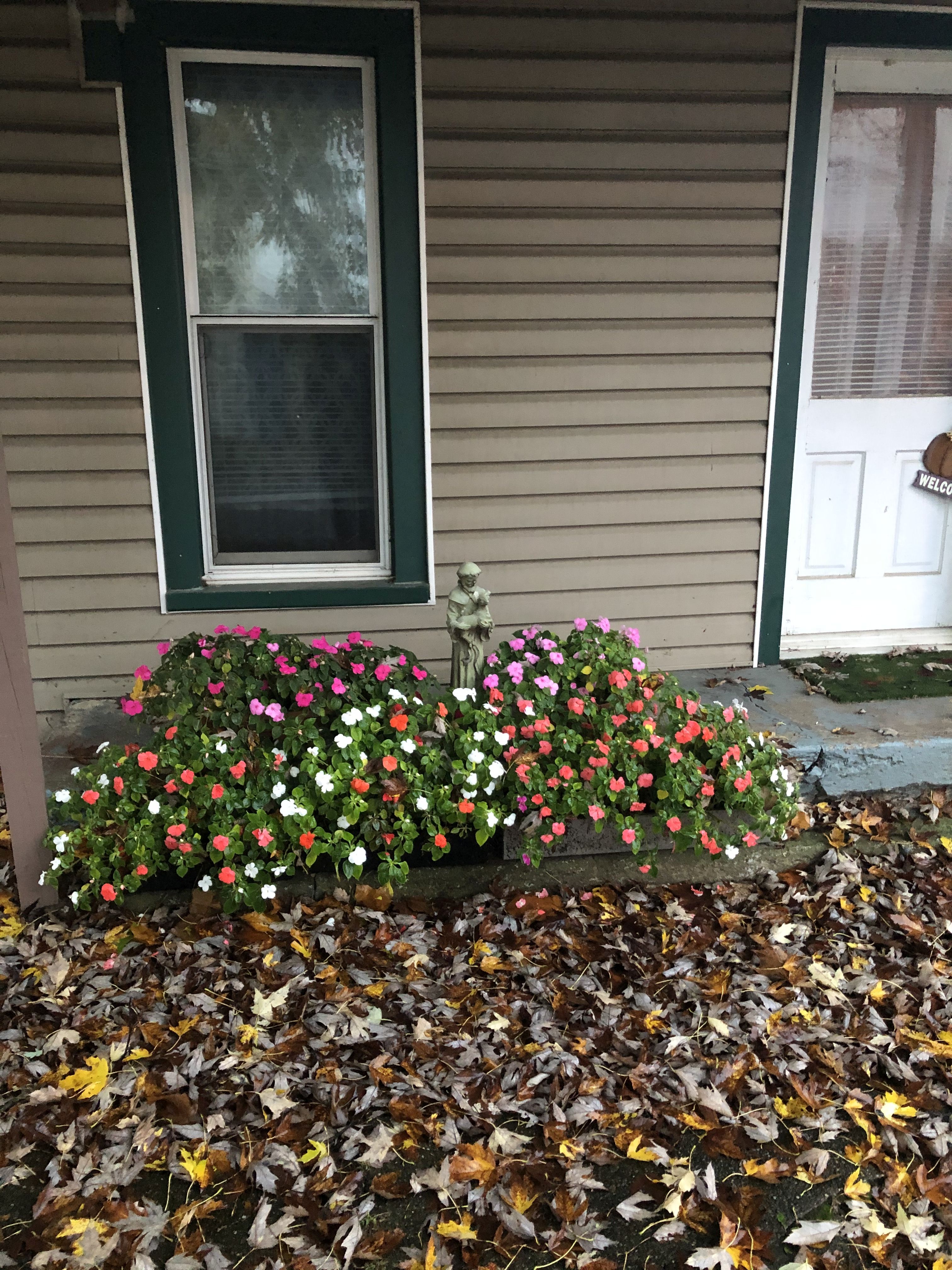 Mostly, I wanted to post a photo of the last of my impatiens. The ones on the kitchen porch bloomed themselves out several weeks ago, but the ones on my front step are still in their glory. However, over the next several nights, the temperatures will dip into the 20s Fahrenheit, so the impatiens will be gone.