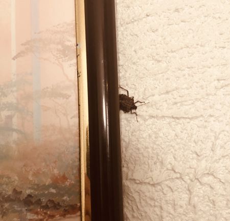 I have several interesting winter visitors right now. Two of whom — a ladybug who’s living around the window frame at the top of the stairs, and a beetle living down in the kitchen — are currently hiding. That, or they’re camera shy because I can’t find them in their usual spots right now. Anyway, here are two brand new visitors: A new spider in my bedroom, and a shield bug living behind one of the pictures in the hall at the top of the stairs:
