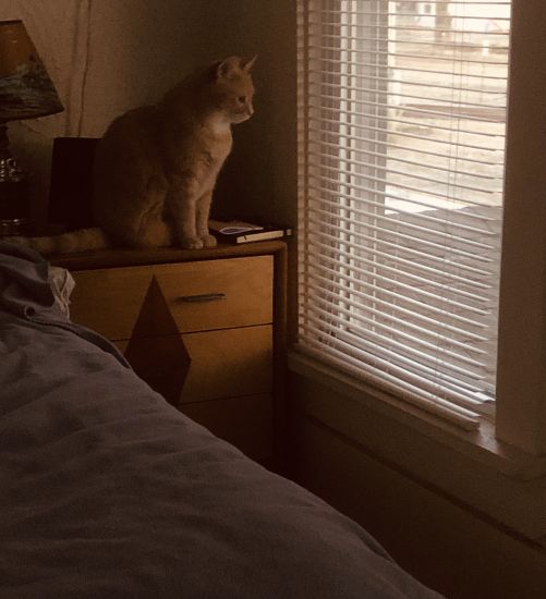 And here’s a photo of Weenie, sitting on my night table as the sun was coming up:
