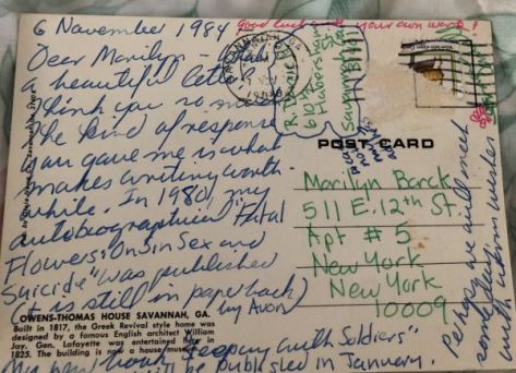 The first postcard I received from the Southern writer/ poet, Rosemary Daniell. I had written her a letter after reading her poetry collection, A Sexual Tour of the Deep South, and she wrote me back and I was so thrilled!! I loved that book so much and still have it (I have all her books). She and I actually eventually became friends. She lived in Savannah, Georgia. This was November 1984.