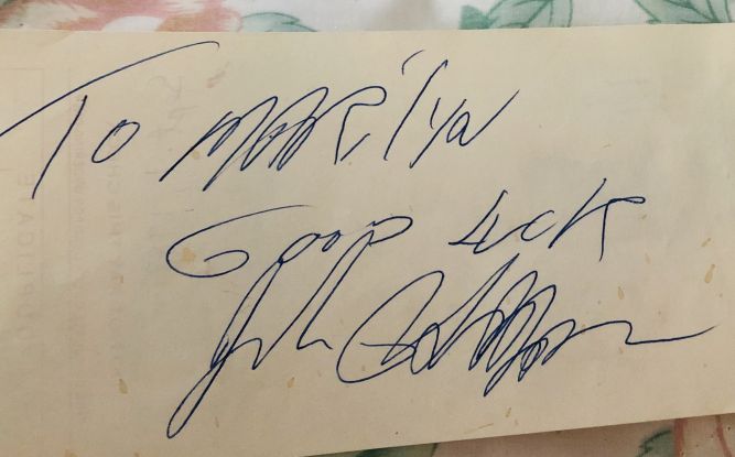 A really close friend of mine was at a restaurant in Midtown Manhattan once and saw Papa John Phillips and got his autograph for me. It’s the only autograph of a famous person that I have. (Papa John was the main guy in The Mamas & the Papas, and wrote all those amazing songs. He’s dead now.) This is fall 1988. At one point, I had made an art project out of this. I made a collage where the autograph (which says “Good Luck”) was surrounded by every little paper fortune I’d ever gotten from a fortune cookie (those cookies that come with Chinese take-out food).