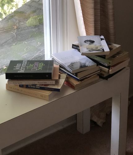 Meaning, that I have to stack books as precariously as possible all around the palm tree so that the cats get scared away from trying to eat the palm leaves and thus absolutely ruining the poor tree.