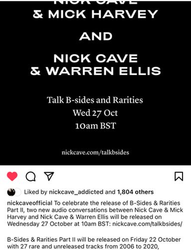 Oh. On Friday, October 22nd, Nick Cave & the Bad Seeds release Vol.2 of B-Sides & Rarities. In honor of that, the following Wednesday, Oct. 27th, there will be two online conversations: