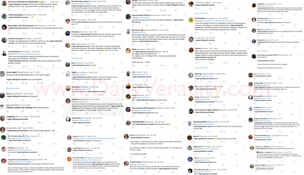 “SHOCK: Thousands on Twitter Say They ‘Regret’ Getting the Va c c in e — ‘Side-Effects Worse than C*VID’ – DailyVeracity Amid reporting on a variety of studies that find a direct causal relationship between an increase in deaths in countries with higher levels of va cc in a tions, seemingly countless Americans are now expressing regret they ever took the C*VID v ac ci ne.