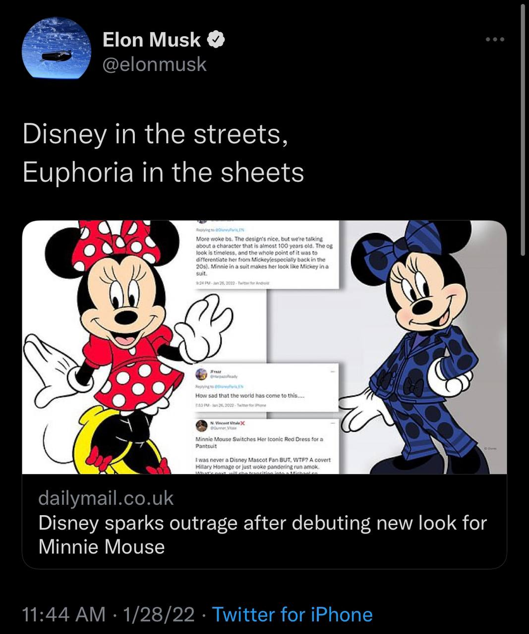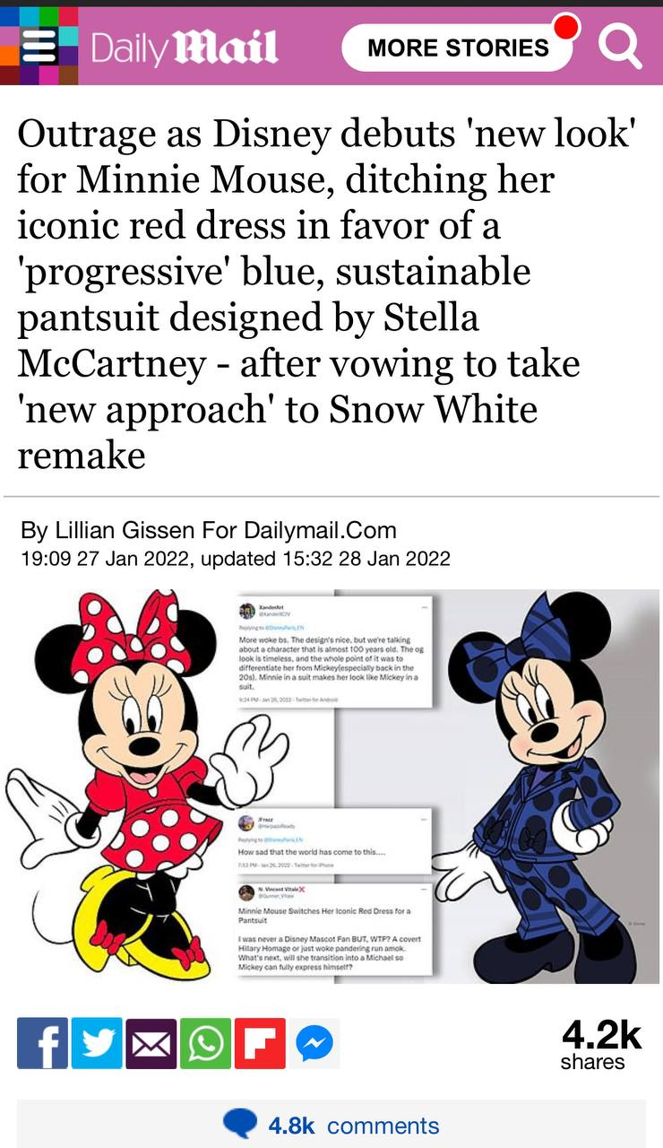 “Outrage as Disney debuts ‘new look’ for Minnie Mouse, ditching her iconic red dress in favor of a ‘progressive’ blue, sustainable pantsuit designed by Stella McCartney – after vowing to take ‘new approach’ to Snow White remake”
