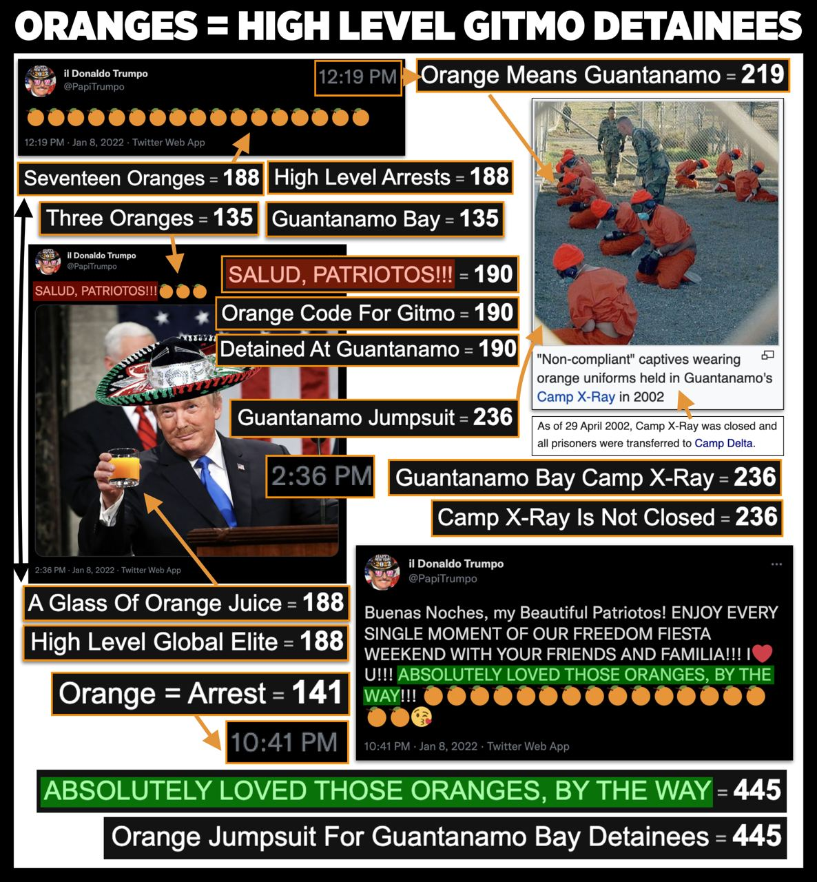 Tr **p dropped three posts with ‘oranges’, which is code for the iconic ‘orange jumpsuits’ at Gitmo. In Tr **p’s first Tweet, he posted SEVENTEEN ORANGES = 188 = HIGH LEVEL ARRESTS. The timestamp of 12:19 => 219 = ORANGE MEANS GUANTANAMO.