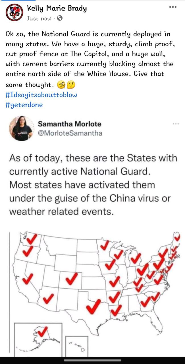 Everyone is now talking about that concrete wall they’re building around the W H — which Nancy first alerted us to on Monday — and how the National Guard is posted on the inside of the wall around the U S Capitol (maybe also the W H wall by now)(?). Clearly this is meant to keep people inside the building, not to keep outsiders from getting in. More tri bu n als? More e xe c utions?