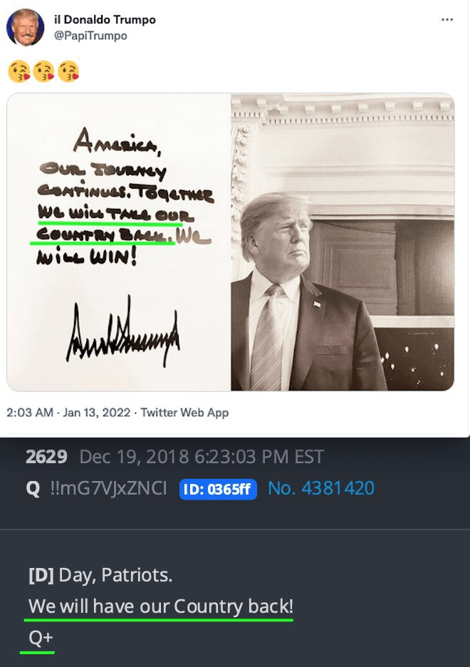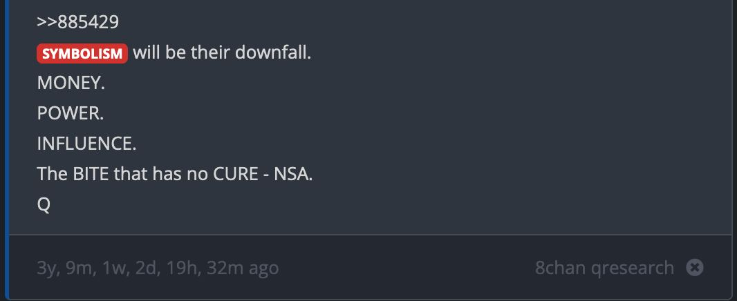 Hillary Clinton couldn’t find anything to pin on Donald Trump. Robert Mueller couldn’t find any dirt that would stick either, despite throwing plenty. Now an impeachment process has failed to name a crime — and resulted in an acquittal. Maybe his accusers have something to hide instead? Speaking of which, would any of the following things be newsworthy in your opinion? • “Many in our [government] worship Satan.” (Q3) • MS13 is a gang paid “to kill [Democrat political] opponents”. (Q5) • There has been a “hostile takeover [of the US Government] from an evil corrupt network of players (not just Democrats).” (Q6) • “Obama ultimately OK’d [HRC’s illegal email server] by using the non [government] email [address] to communicate [with] Clinton. Obama also had an alias along with each of his cabinet members [which is illegal].” (Q7) • “…false local/national black leaders are corrupt and paid off to help keep the black [population] poor and in need.” (Q9) • The FBI and Military Intelligence “have an open investigation into the Clinton Foundation” related to the Haiti crisis, and the disappearance of children? (Q10) • The 2016 election was “suppose to be rigged [for HRC]” and “good people [prevented] the rigging”. (Q14) • “Soros, Clintons, Obama, Putin, etc. are all controlled by 3 families” (Q15) • “The corruption that will come out is so serious that deals must be cut for people to walk away otherwise 70% of elected politicians would be in jail.” (Q15) • We knew in October 2017 that Trump is “100% insulated with zero risk of impeachment (fact).” (Q16) • Nancy Pelosi is faking her memory going as protection against prosecution. (Q18) • The treasonous “CIA thinks its foreign offshore assets are strong enough to defend against the US executive (not accounting for military use on domestic soil).” (Q23) • “Any person making statements they will not be seeking re-election was put in submission. For the betterment of the country not all will be prosecuted and all will do as told.” (Q24) • North Korea is “not being run by Kim, he’s an actor in the play.” (Q29) • “The child abductions for satanic rituals (ie Haiti and other 3rd world countries) are paused” (Q29) • “Would you believe a device was placed somewhere in the [White House by the Obama admin] that could actually cause harm to anyone in the room [subsequently] and would in essence be undetected?” (Q30) • There is a “World [political] stalemate. We all have the goods on everyone else. That’s part of the reason why some things that tie back to foreign heads of state will remain classified (not all).” (Q31) • The text of a future public announcement that “over the course of the next several days you will undoubtedly realize that we are taking back our great country (the land of the free) from the evil tyrants that wish to do us harm and destroy the last remaining refuge of shining light.” (Q34) • Prospectively… “On POTUS’ order, we have initiated certain fail-safes that shall safeguard the public from the primary fallout which is slated to occur 11.3 upon the arrest announcement of Mr. Podesta (actionable 11.4).” — with 2020 increasingly looking like dates on which this is executed, after the election. (Q34) • Patriots recorded the corrupt “tarmac deal” of Bill Clinton and Loretta Lynch, which in turn forced the hand of Comey in the 2016 election. (Q36) • “If Trump failed… and HRC assumed control [in 2016], we as Patriots were prepared to do the unthinkable (this was leaked internally and kept the delegate recount scam and BO from declaring fraud).” (Q36) • Obama was helping to arm North Korea with nuclear weapons using US miniaturisation technology? (Q39)
