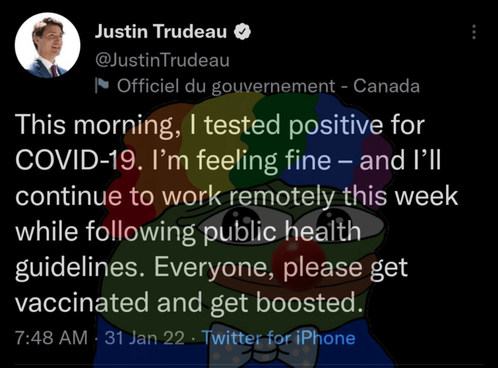 “Tr * deau breaks his silence to tell everyone he tested positive for C* vid and that’s why he needs to keep hiding. It has nothing to do with the massive convoy honking for freedom. Nothing to do with that at all. 🤣”