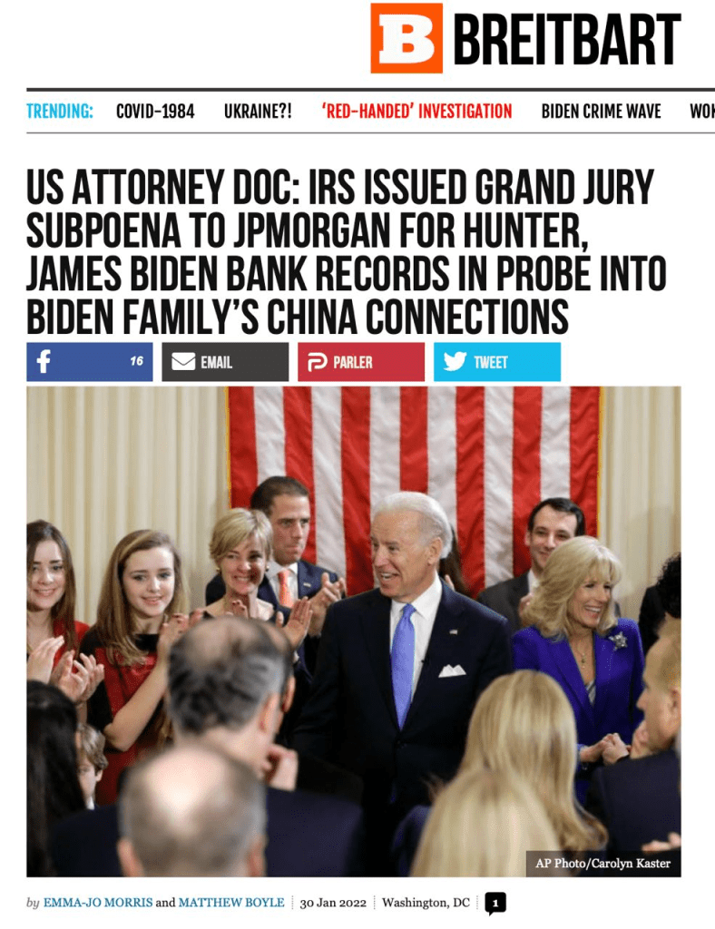 “This wide-ranging grand jury subpoena suggests that Joe’s son and brother received transfers from an account with the Bank of China. The question that remains is why Bill Barr directly intervened to ensure that the U.S. Attorney in Delaware’s investigation into Joe’s family was kept from the public for over 17 months until after the election, as previous reporting has confirmed. David Weiss and Bill Barr—or someone with a conscience inside the Justice Department—should answer that question for the American people,” Ziegler said in a statement to Breitbart News.”