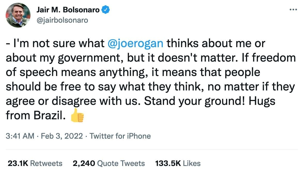 “Brazil President Bolsonaro Tweets Support for Joe Rogan