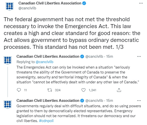 “JUST IN – The Canadian Civil Liberties Association states the government has not met the Emergencies Act threshold.”