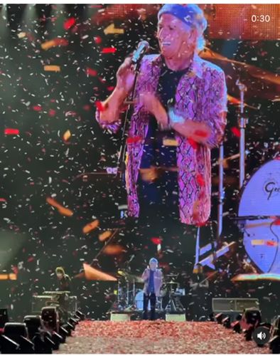 This also happened yesterday — in Madrid! The Rolling Stones!! All that confetti is because it was Ronnie Wood’s 75th birthday on Wednesday. (If you look closely, you can see the actual Keith on stage, standing in front of the giant-sized Keith on the screen. Followed by a really, really happy-looking Mick and Ronnie!! The stadium was absolutely packed.)