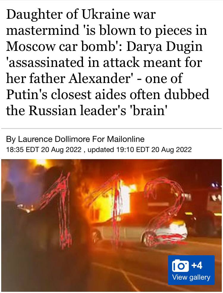 “Darya Dugin was ‘blown to pieces’ in a Hollywood-style ‘assassination plot’ near the village of Bolshiye Vyazyomy, on the outskirts of Moscow.”