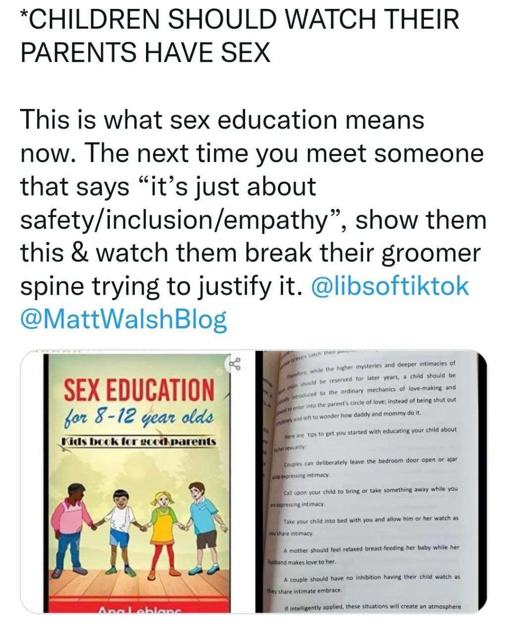 “sex education book for 8 to 12 year olds” calls for parents to leave the door open while having sex ON PURPOSE so theor children can watch… and “learn”. In fact. They even tell you to “trick” your child into intemtionally exposing them. Sounds about right for GROOMING.”