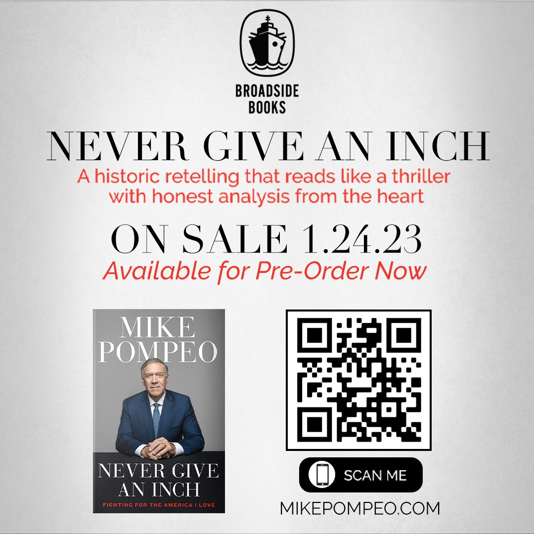 “Want the inside scoop and “behind the scenes” stories from my time as Secretary of State and CIA Director? Good news: my book – “Never Give An Inch” – is officially available for pre-order. Reserve your copy today! http://MikePompeo.com“