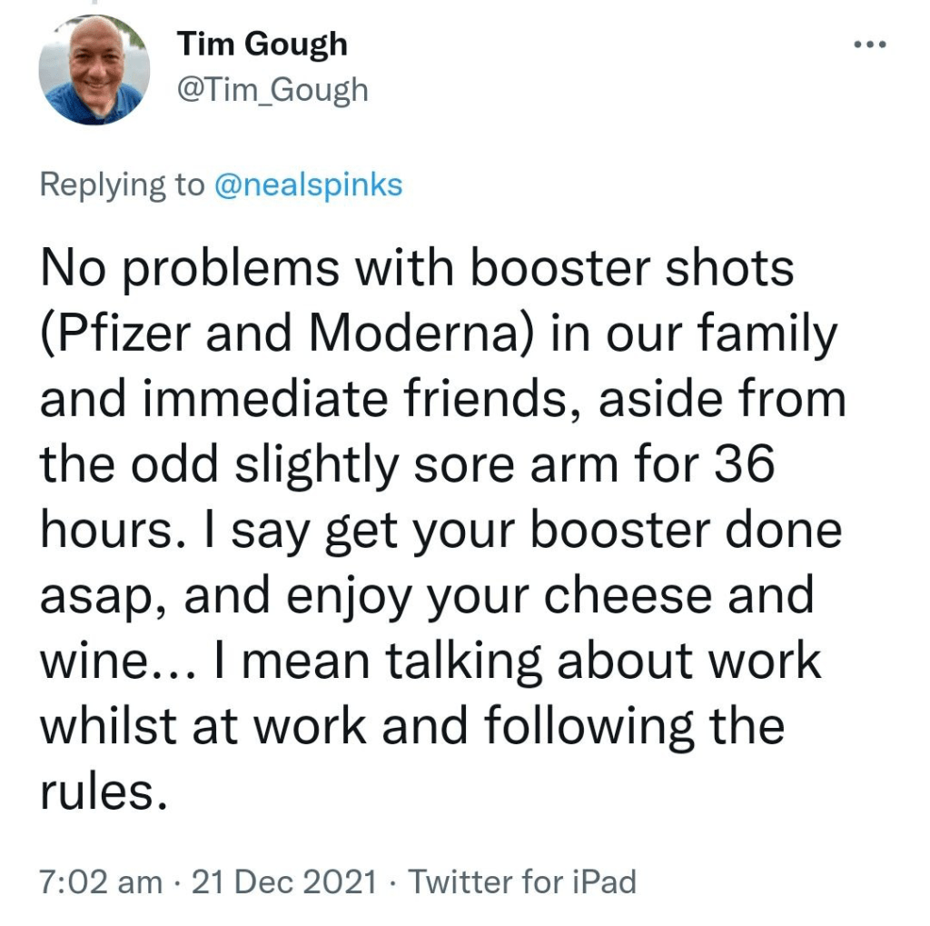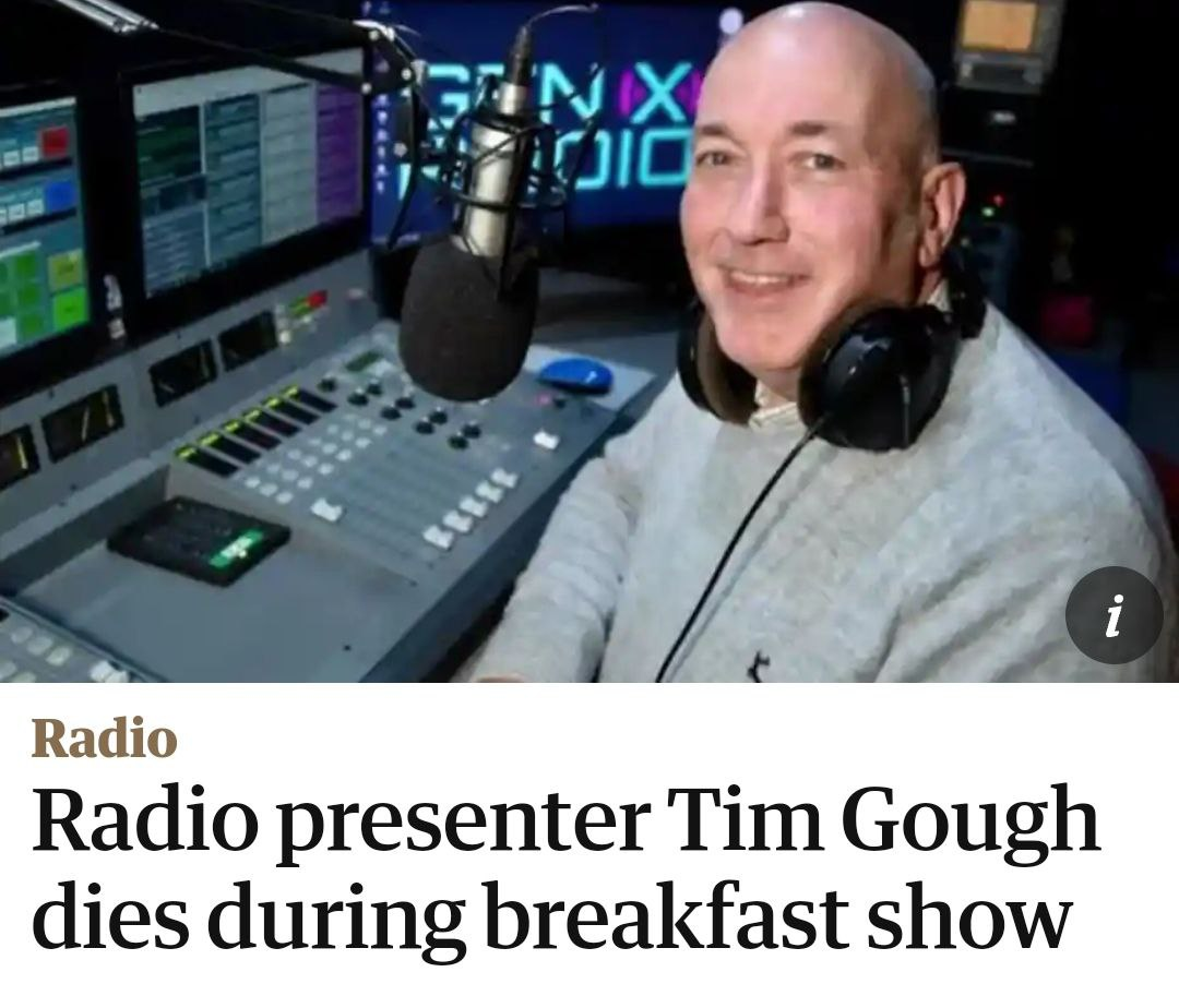 “Radio presenter Tim Gough dies during live broadcast. This is becoming a common trend now. People once boasting about getting vaccinated are now dropping dead.”