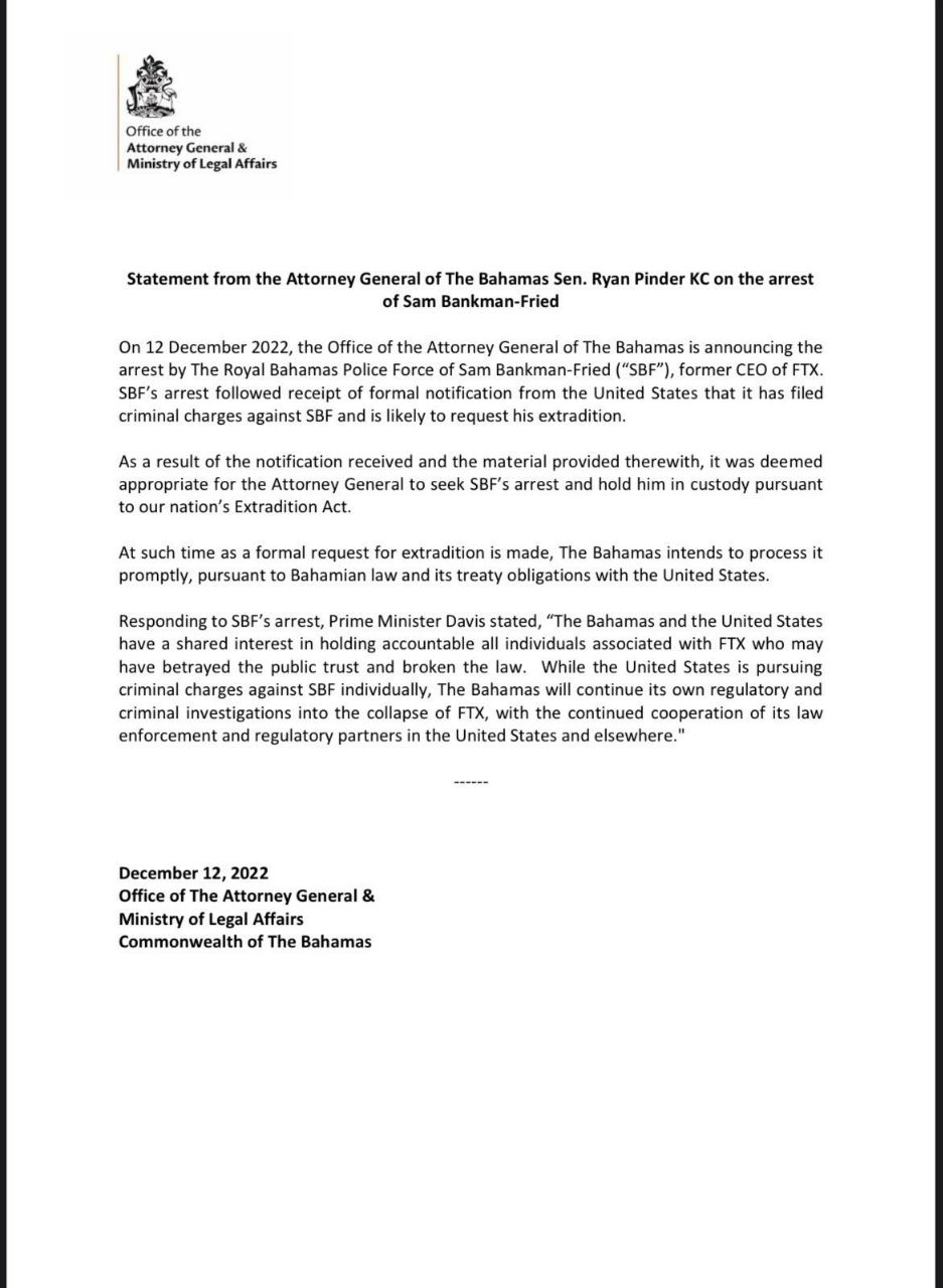 On December 12, 2022, the Office of the Attorney General of The Bahamas is announcing the arrest by The Royal Bahamas Police Force of Sam Bankman-Fried (“SBF”), former CEO of FTX.”