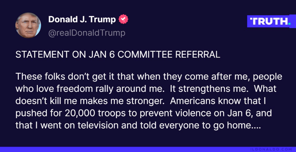 […] The panel holds its final meeting of the year on Monday. Its report on its findings will be released on Wednesday of next week as it wraps up its work before it’s disbanded. At its Monday meeting, the panel members will vote on recommending charges against the former president, including insurrection; obstruction of an official proceeding; and conspiracy to defraud the United States government, Politico reported.