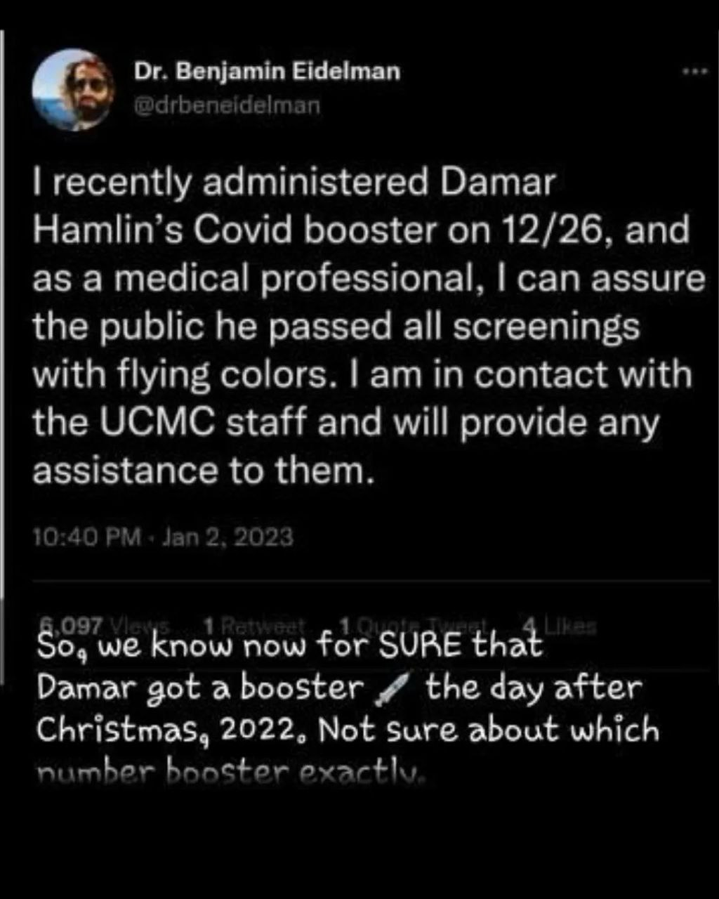 “Surprise damar hamlin triple jabbed a week before “collapsing suddenly” but dont mention his jab status conspiracy theorists!”
