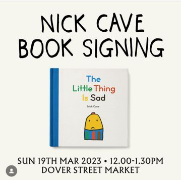 “To celebrate the arrival of the Cave Things installation and exclusive product at Dover Street Market, Nick Cave will sign copies of his new children’s book ‘The Little Thing Is Sad’