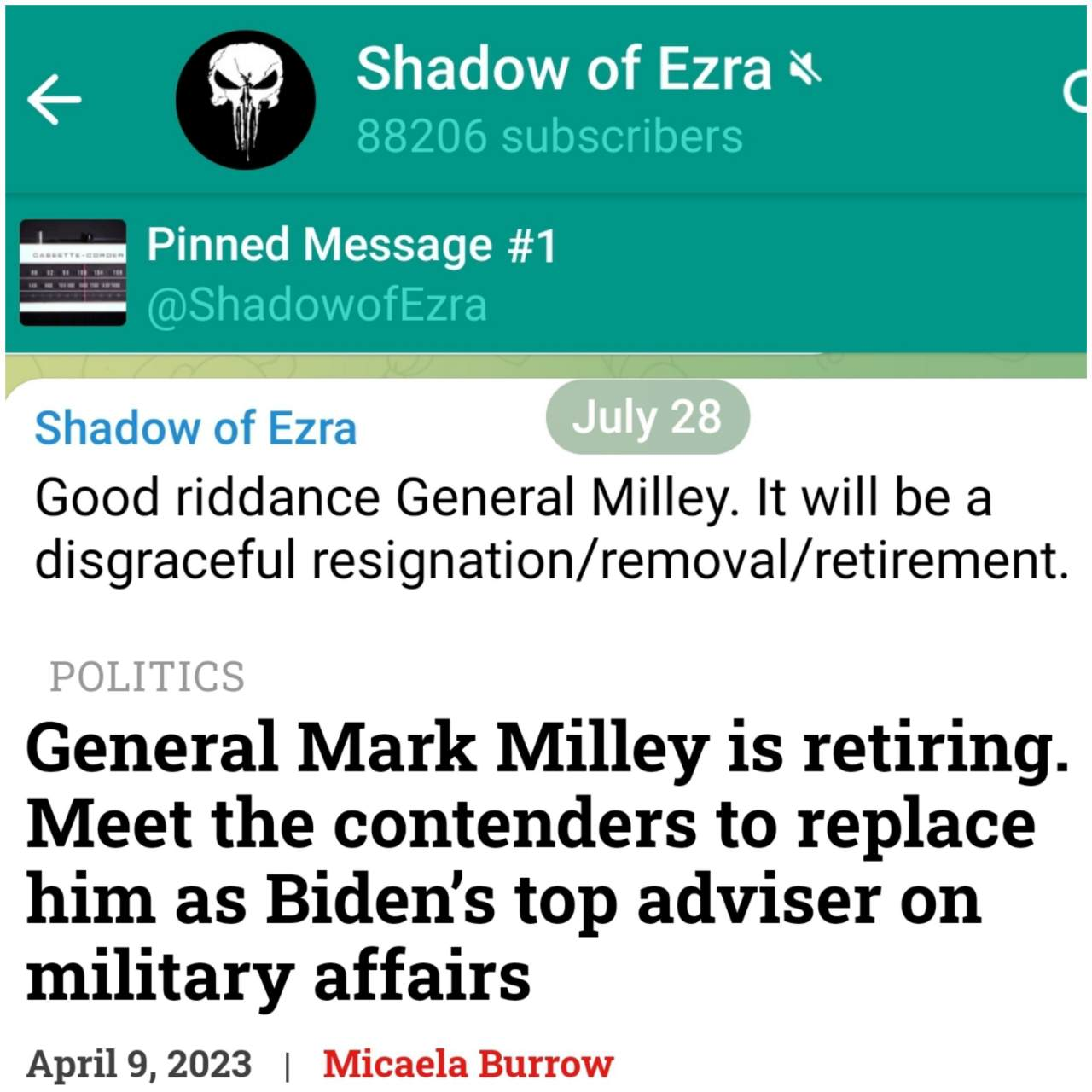 This was from Shadow of Ezra yesterday — Milley has been under White Hat control for a long time now, but I guess it is finally time for him to be gone, baby, gone: