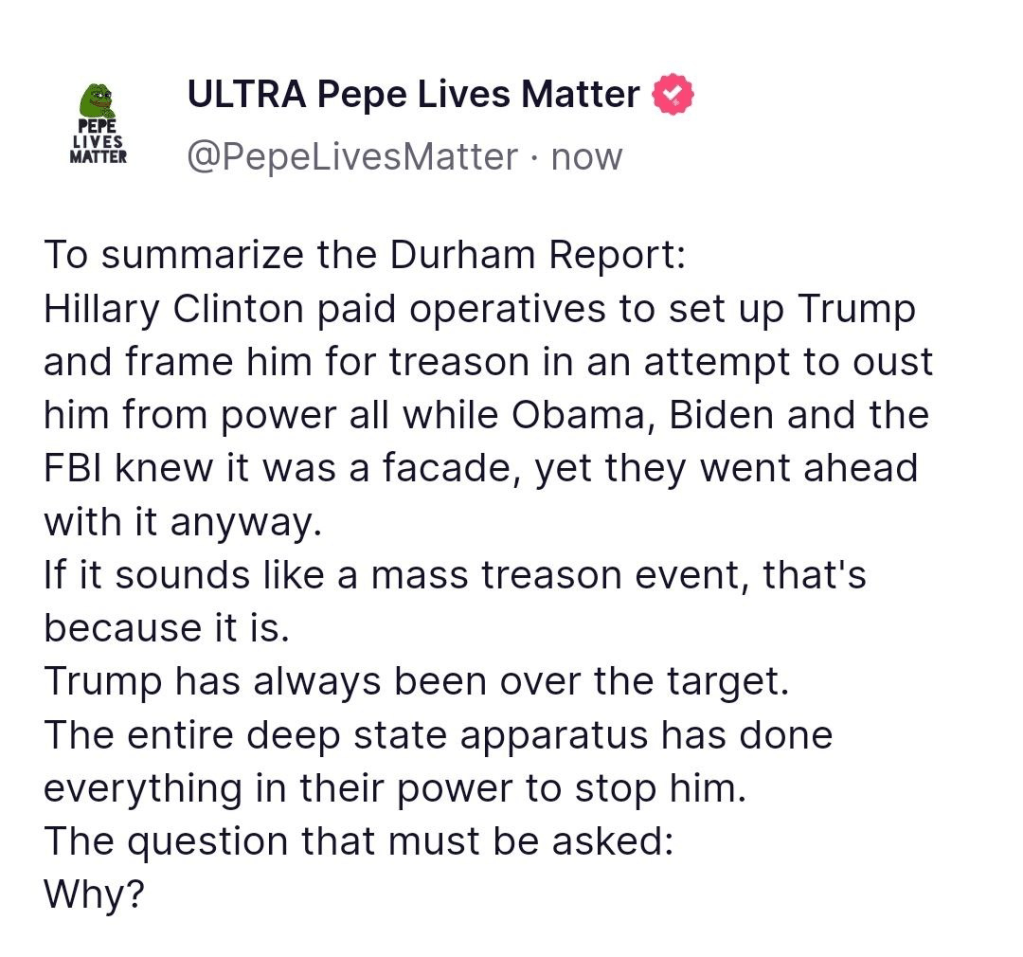 “NewsFlash: Durham Report out: it says the exact same thing @DevinNunes and I put out 5 years ago… the Truth. No justification to launch, fbi n doj lied, clinton paid for it n fake news mafia the biggest coconspirators”