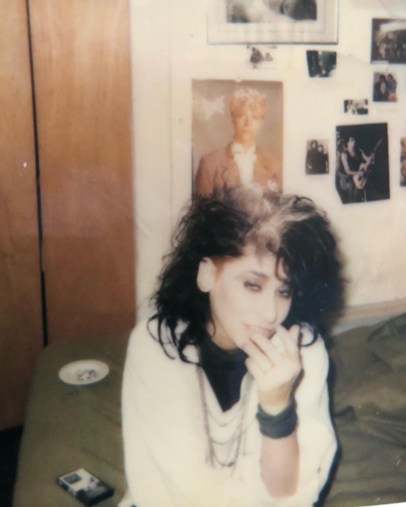 (BELOW: The bassist now known as Blare N. Bitch in my room at about 3AM in 1985. Note these things: Many photos of Keith taped to my wall, along with other people. The ashtray on the bed — you always want to do that, gang, because beds are super flammable. The Lou Reed cassette tape for New Sensations. I LOVED that album!!)