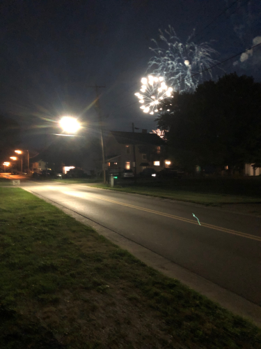 I was home in plenty of time last night to hang out on my kitchen porch and watch the fireworks. And I took a couple pf photos with my phone to send to a friend. They are not very good photos, but here they are anyway!