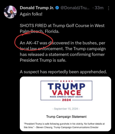 Then yesterday’s assassination attempt involves an AK 47 found in the bushes on the golf course where Trump is playing golf…