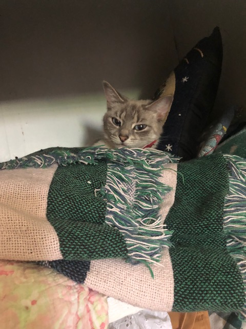 Saffie, a few minutes ago, back in her favorite spot in the linen closet: