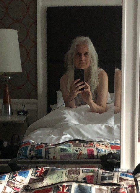 (Me, in my hotel room bed in NYC, 3 weeks ago, at 5:03 AM) (And ditching the nightgown and wearing a sundress instead will likely be a big help!) (Oh! I might comb my hair, too!)
