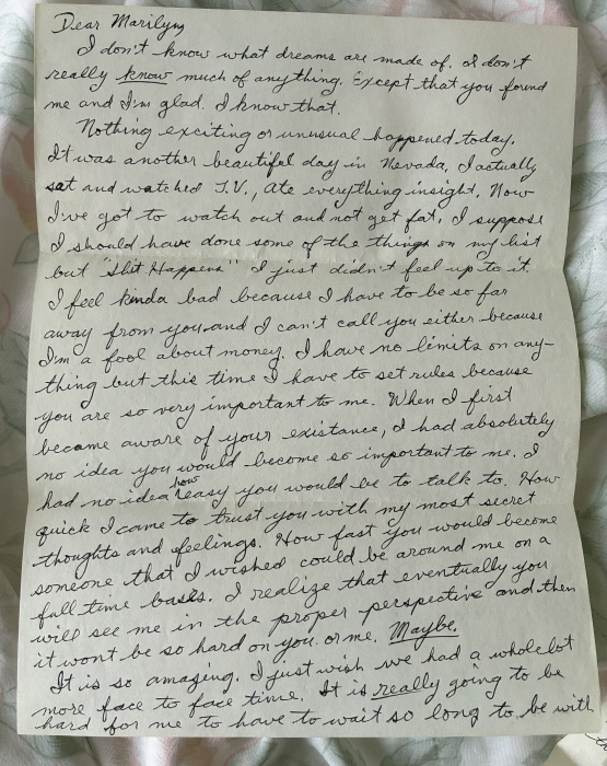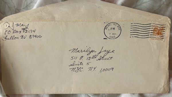 Re-reading this specific letter yesterday, blew me away. And what’s interesting about the envelope is that he didn’t put my last name. I was still a professional singer back then and I went by “Marilyn Jaye.” My birth dad was so proud of my songwriting. He was also a songwriter, guitar player and singer (blues/country). I also like how he wrote “Suite 5” when that was truly a hellhole apartment!