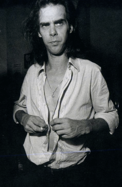 Nick Cave — many years ago, uncertain about whether he should take the shirt off or just keep sleeping in it.