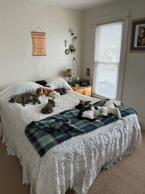 (In no particular order: Cuddles, Queenie, Princess, Goldie, Calico, Freddie McFee, and Bobbie McGee, and a stuffed animal…)