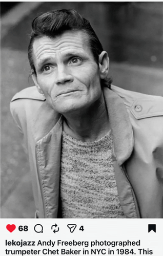 Sort of a haunting photo of Chet Baker. NYC, 1984. Near the end of his life. He died in 1988.
