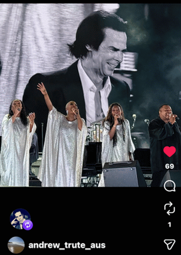 From the recent “Wild God” Tour of Australia, in Sydney. Nick Cave on the jumbo screen, overlooking the backup singers onstage: