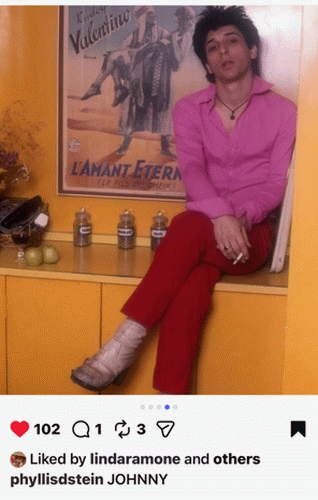 Johnny Thunders in London in 1977, but he is sitting in front of a movie poster for “The Sheik” starring Rudolph Valentino!! (Star of my masterpiece-recently-re-published novel, Twilight of the Immortal!!)