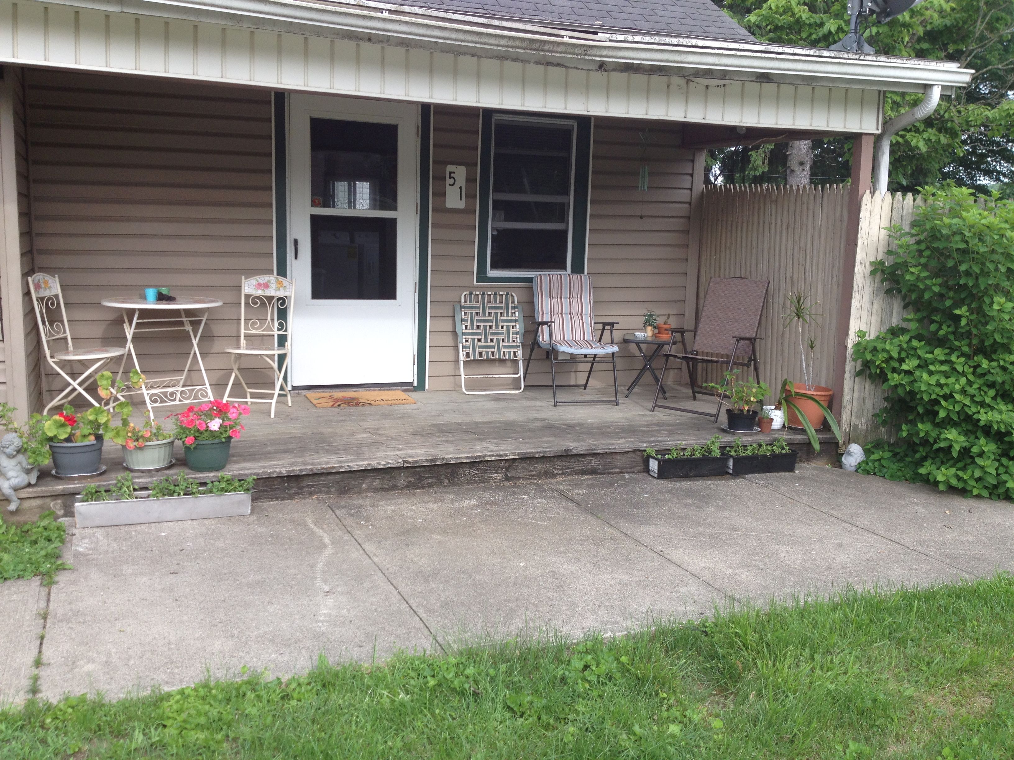 Anyway, here’s the side porch! The plethora of accidental petunias are in flower boxes down there at the front of the porch step.