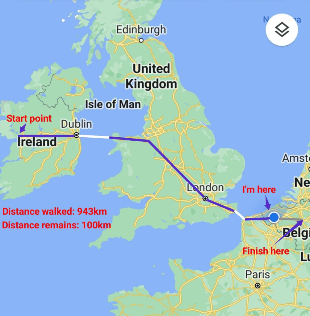 “Here’s the current progress of the 1000km walk from Galway to Brussels. I currently have walked 943km with 100km remaining until I reach the EU Commission in Brussels. So far I’ve walked through Ireland, Wales, England and France with Belgium remaining.