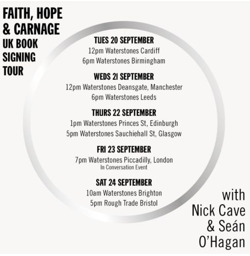 In September, Nick Cave will do a book signing tour in the UK, in support of his upcoming memoir Faith, Hope & Carnage, Yay!!!