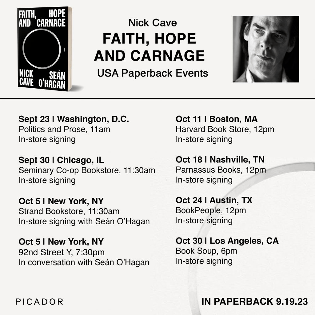 Thursday, Nick Cave will be doing an in-store signing at the Strand Bookstore on the corner of Broadway & E. 12th Street, and an “In Conversation” at the 92nd Street Y, promoting the US paperback release of his book, Faith, Hope & Carnage.