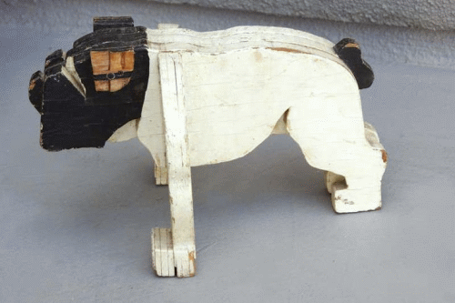 This is an example of the wooden toy his father used to make — & sell — when he had a stall on the Boardwalk in Ocean City, NJ, back in the early 1930s! A black & white bulldog. He made them by hand. We’re not positive, but this could be one of the actual ones his father made. (We found it online — listed as “Folk Art from the 1930s.”)