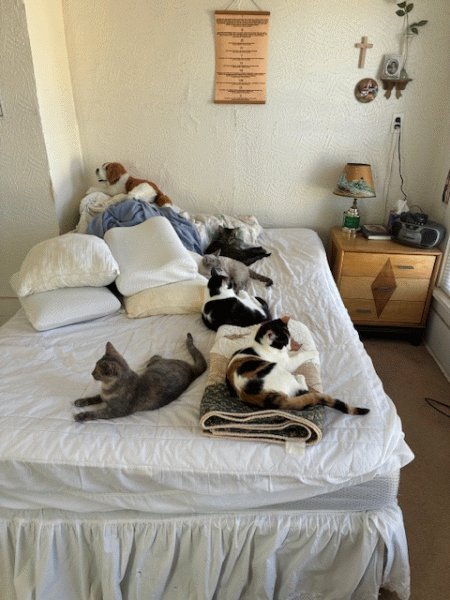 Now that Big Blackie and Little Blackie have passed away, Kon Tiki is the only cat who lives out on my kitchen porch now, but I still have the four straw-filled cat houses out there that the neighbors made for me last year. And Kon Tiki uses all four of them now. I never know which house she will come out of in the morning when I open the kitchen door and call her in for breakfast… She’s mean but she’s too cute!!