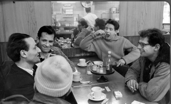 From the Jack Kerouac Estate Instagram page, from left: John Cohen (back of head), Larry Rivers, Jack, David Amram, and Allen Ginsberg.