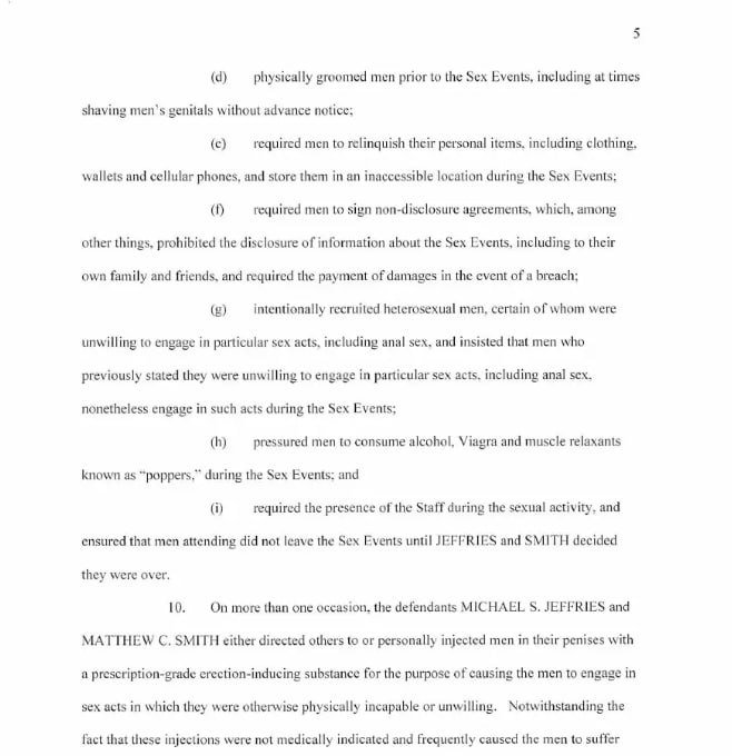 “Intentionally recruited heterosexual men, certain of whom were unwilling to engage in particular sex acts, including anal sex, and insisted that men who previously stated they were unwilling to engage in particular sex acts, including anal sex, nonetheless engage in such acts during the Sex Events;(h)pressured men to consume alcohol, Viagra and muscle relaxants known as poppers, during the Sex Events; and(i)required the presence of the Staff during the sexual activity, and ensured that men attending did not leave the Sex Events until JEFFRIES and SMlTH decided they were over.”