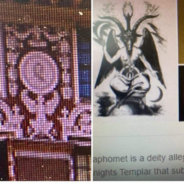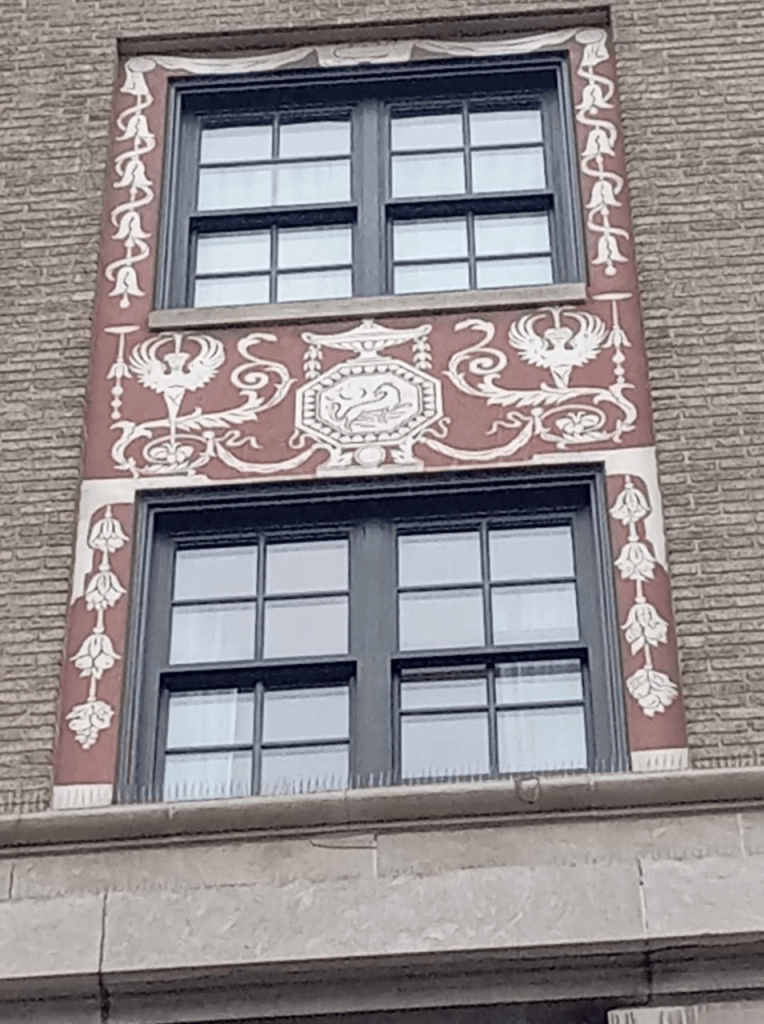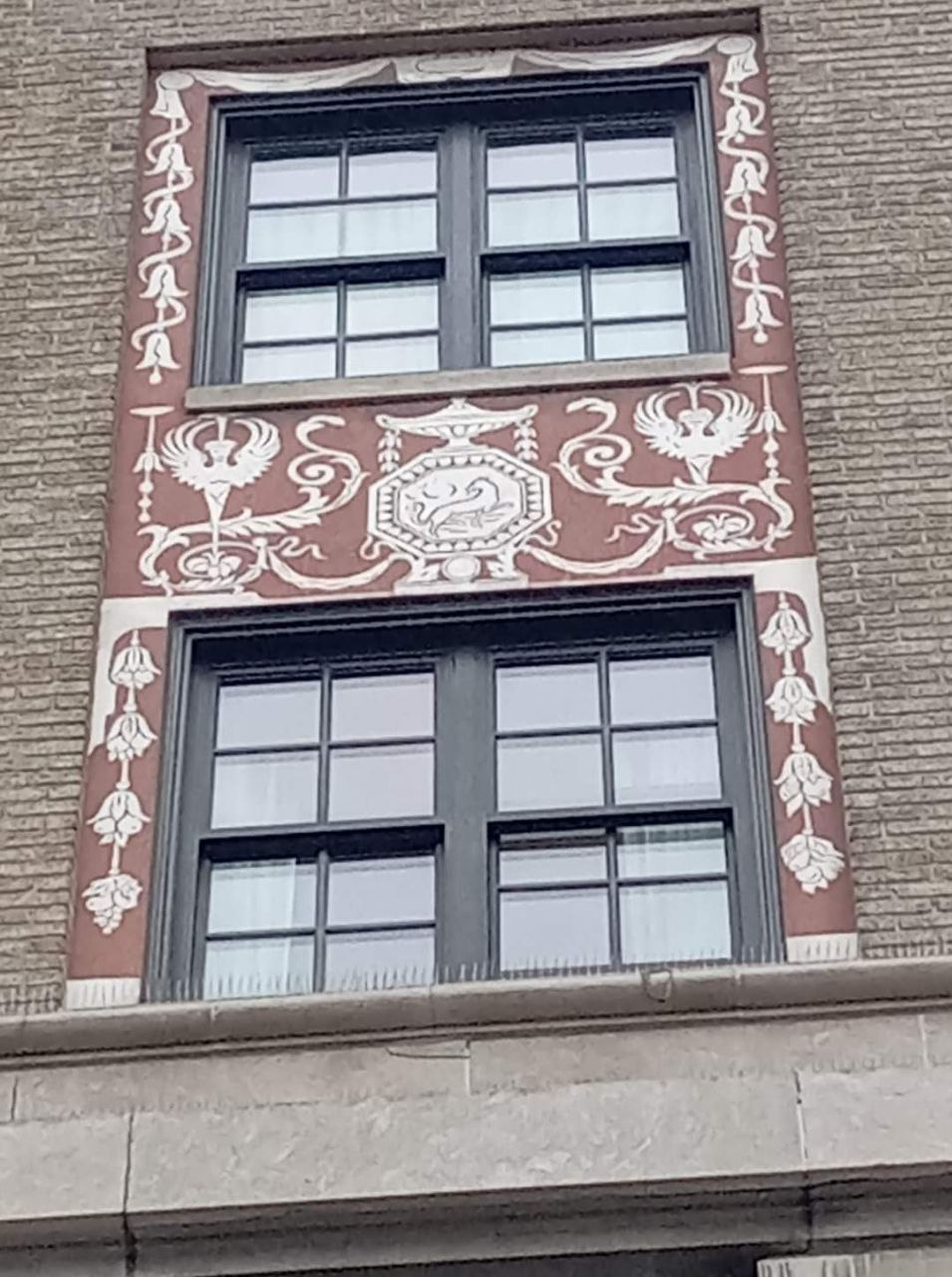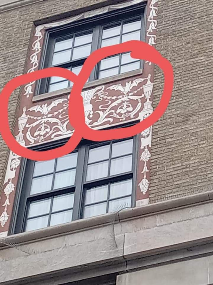 Tons of symbolism on The Hotel Washington. Bats, owls, griffins, upside down flower pots, and this resembles Baphomet 🤔🧐”